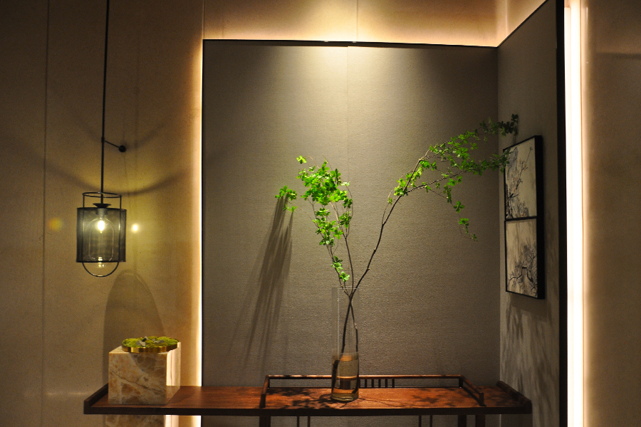 燈光是空間藝術(shù)氛圍的調(diào)節(jié)師, 在整個室內(nèi)的主體色為暖色系的環(huán)境中盡顯純粹、熱烈而沉靜; 以出則繁華,內(nèi)蘊(yùn)自然為設(shè)計概念, 高層次地追求天人合一; 特別是燈光的投射與不同位置的藝術(shù)裝置鋪陳相結(jié)合的關(guān)系,孕育出別樣的可能, 我們想在空間中打造出只能看見“光”,卻看不見“燈”的效果; 所以不僅僅是燈光設(shè)計,也是對影子的設(shè)計。