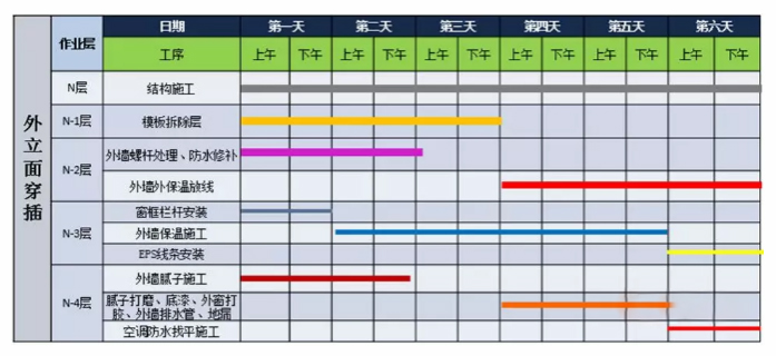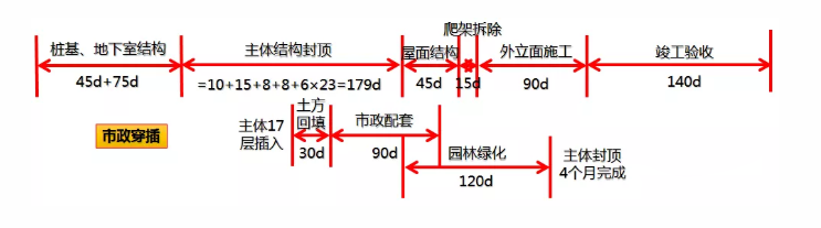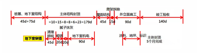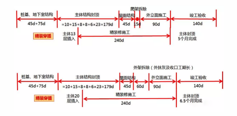 精裝進場時間:=N/n+28/6+1=11層精裝完成時間:=19*6+(M-1) *6 =150天(相對主體結(jié)構(gòu)封頂)