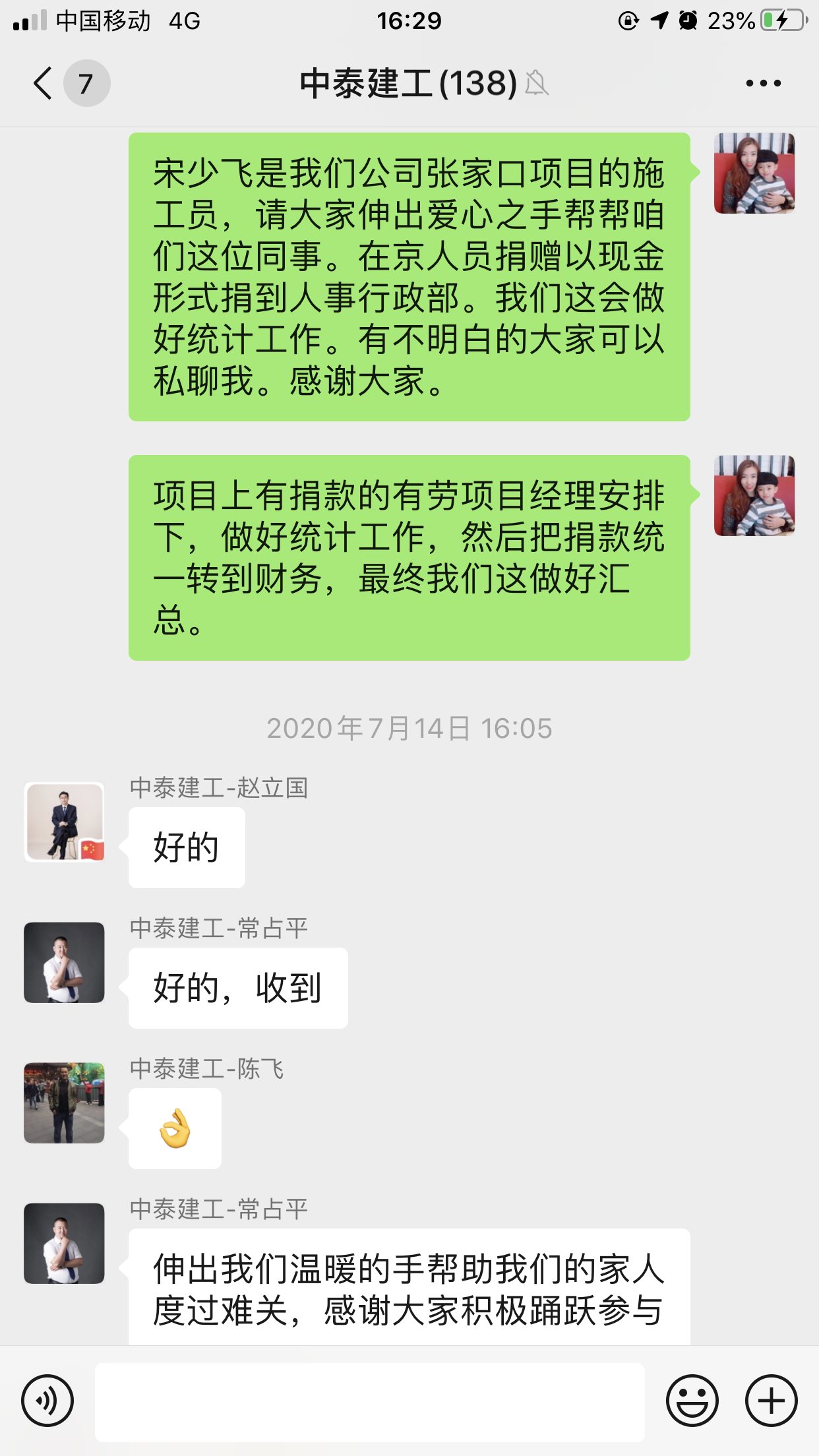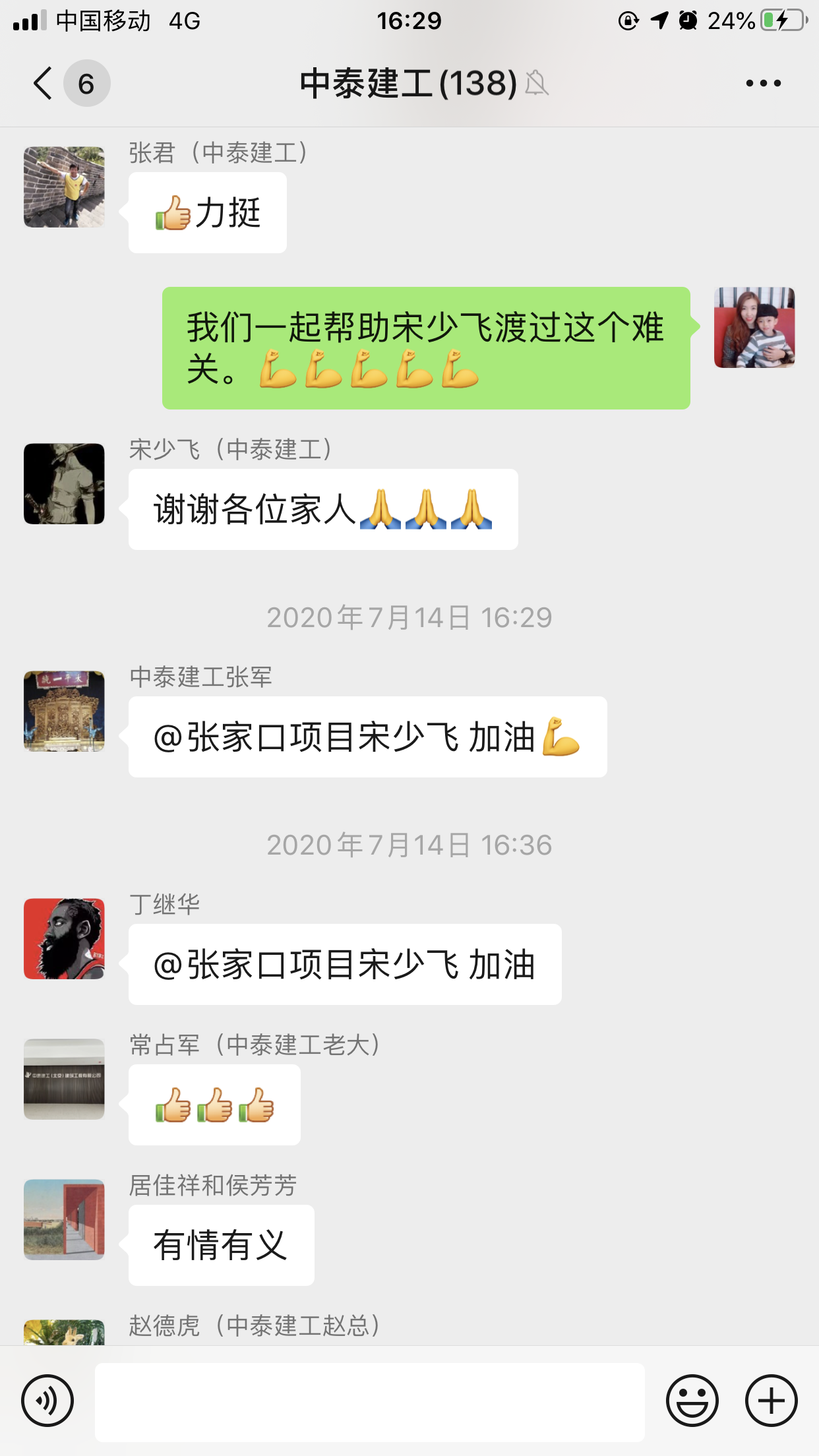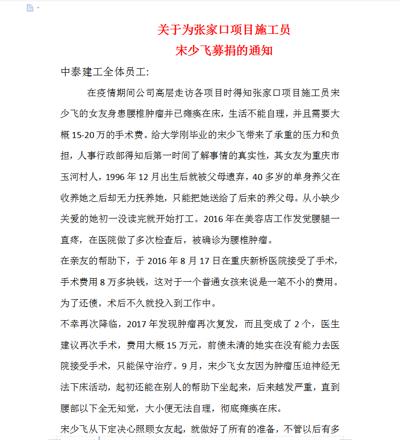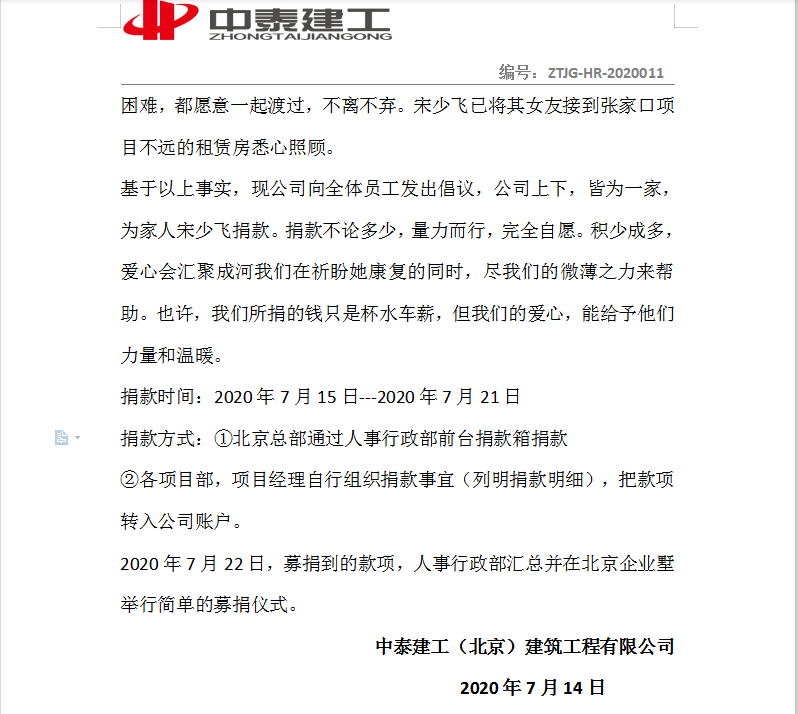疫情期間,中泰建工(北京)建筑工程有限公司領(lǐng)導(dǎo)走訪各項(xiàng)目時(shí),聞悉此情況后,由公司黨支部和工會(huì)牽頭倡議發(fā)起了為員工宋少飛募捐的活動(dòng),號(hào)召全體員工伸出援助之手。