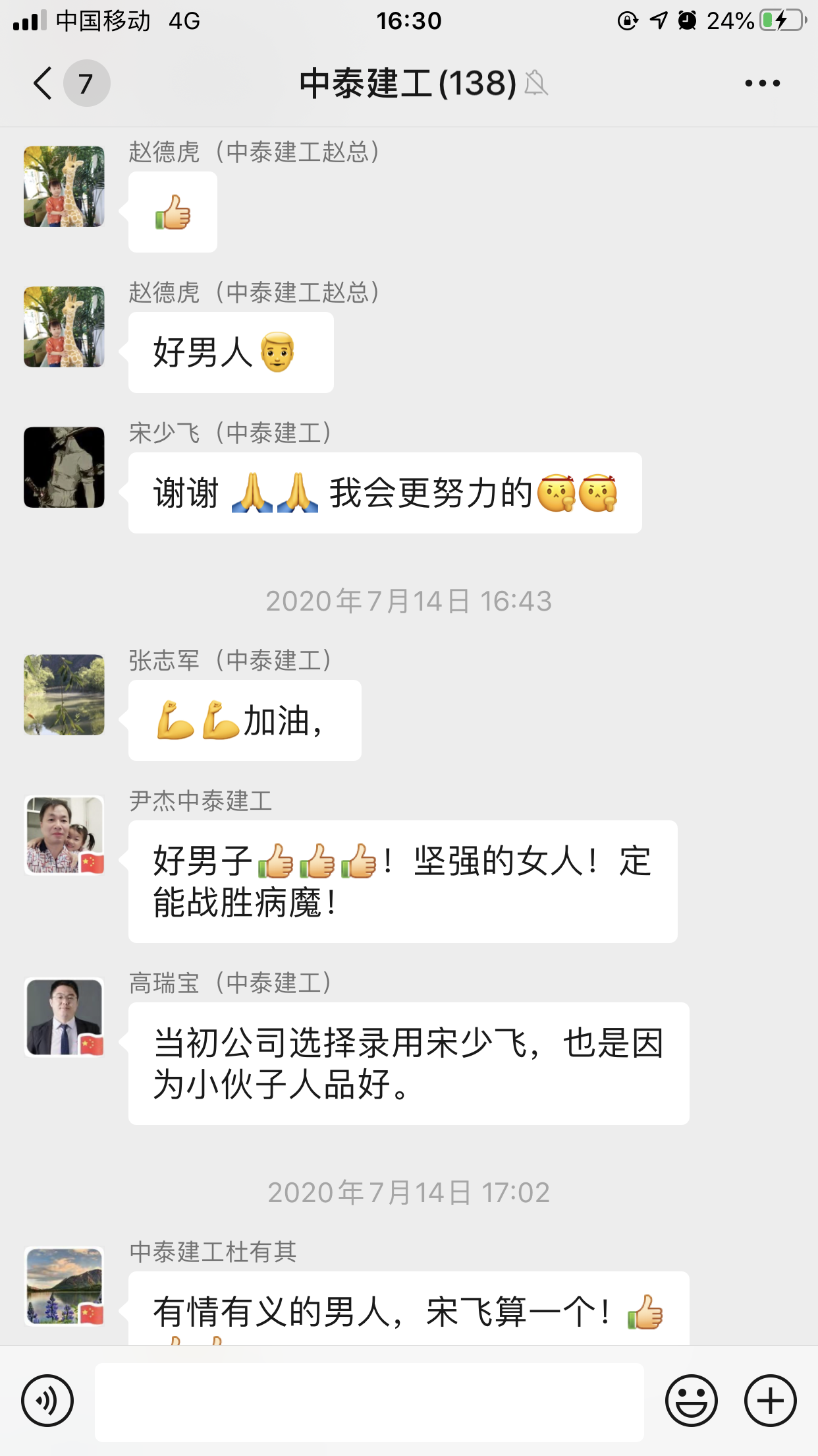 涓涓細(xì)流可以流淌成浩瀚大海,點(diǎn)滴善舉可以匯聚成愛的洪流。我們共同希望宋少飛和他女友冉春花能夠迎難而上,早日戰(zhàn)勝病魔,重樹生活的信心和力量!在中泰建工這個(gè)和諧大家庭,我們一起體驗(yàn)感動(dòng)和力量,一起傳遞堅(jiān)強(qiáng)和希望。
