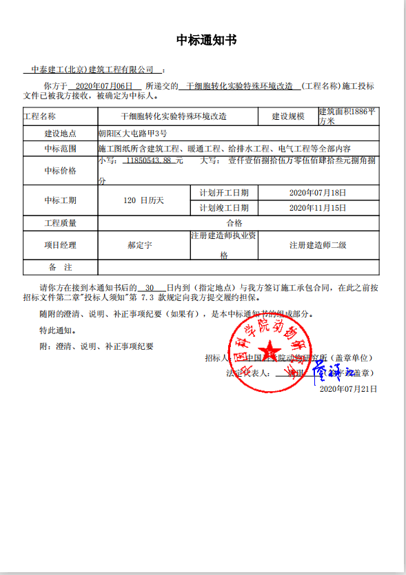 中泰建工喜訊不斷,捷報(bào)連連,成功中標(biāo)「中國(guó)科學(xué)院動(dòng)物研究所干細(xì)胞實(shí)驗(yàn)室凈化工程項(xiàng)目」。