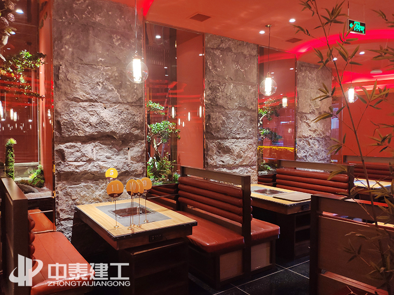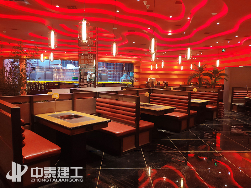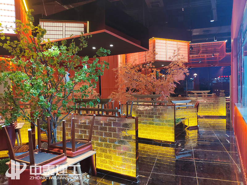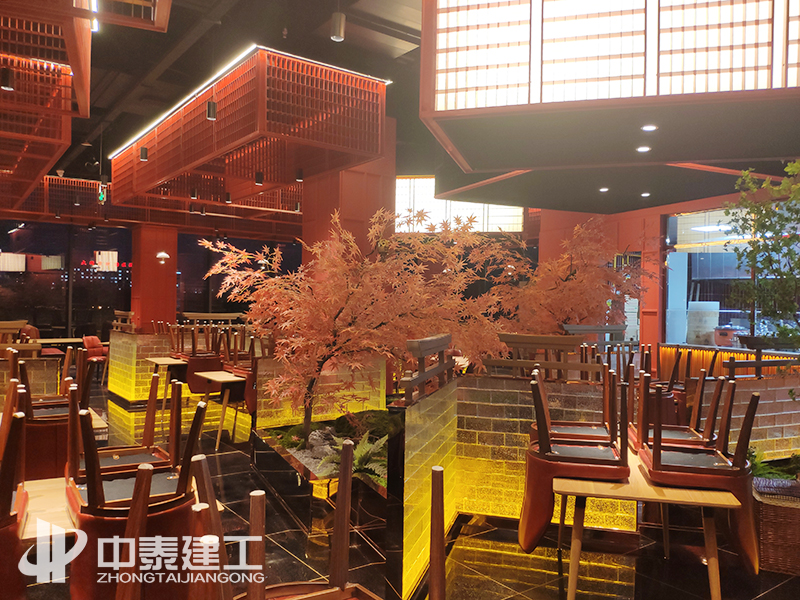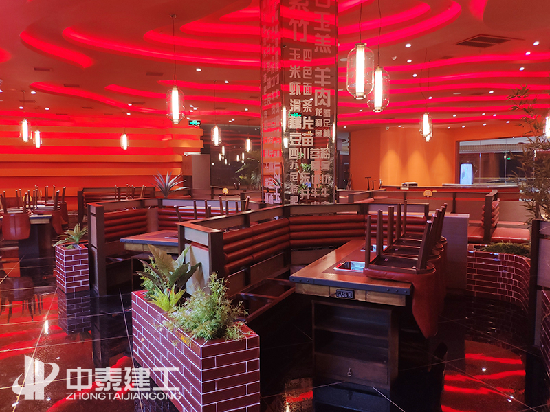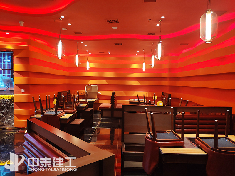 工程概況:本工程包括給排水、電氣、木門及玻璃門安裝、玻璃磚隔斷墻、石材干掛及墻地貼磚、吊頂、室內(nèi)乳膠漆、不銹鋼裝飾、景觀花藝等圖紙范圍內(nèi)的內(nèi)容。蒙度餐廳以紅色系、金黃色系為主,頂部為多層云狀吊頂,邊緣做暗藏?zé)魩Р?;墻面以云狀凸出造型為主,配以線性燈裝飾;地面與餐位鑲嵌擺放景觀,使整體效果即紅火又自然。湘菜館主要以紅色鐵藝造型及金色不銹鋼為主,配以景觀花藝、玻璃磚隔斷及燈光照明,使就餐環(huán)境優(yōu)美自然。