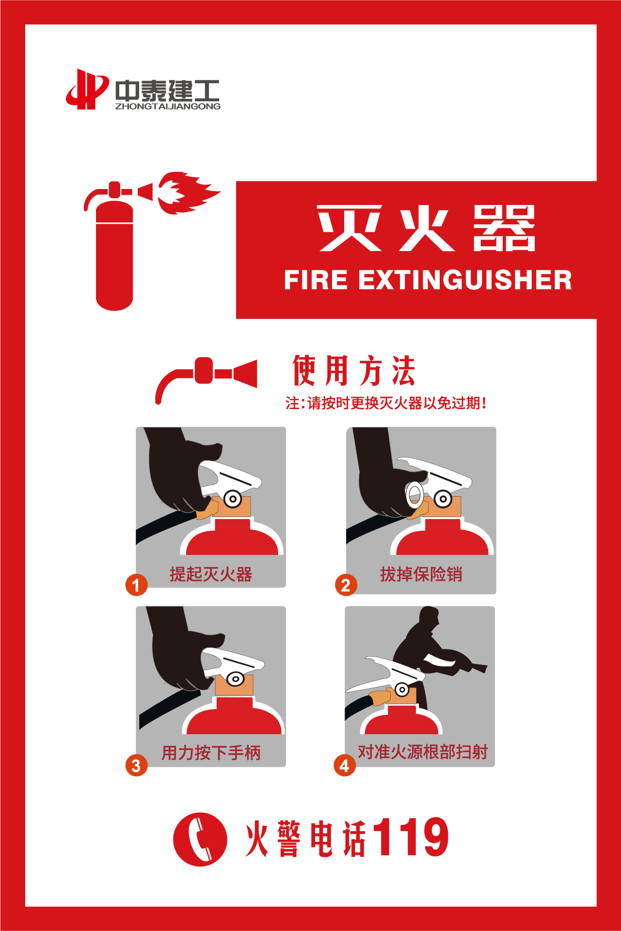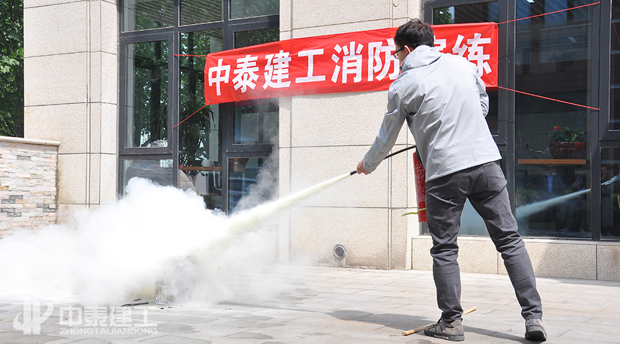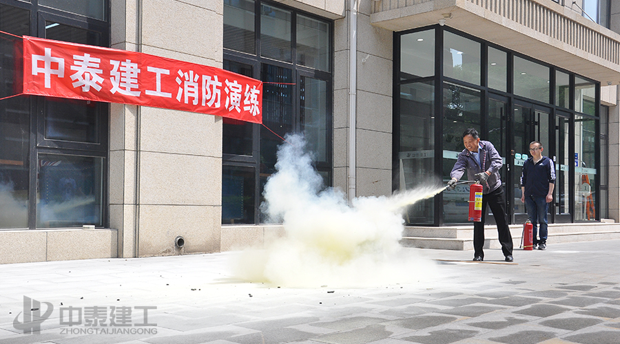 下圖為中泰建工員工對于常見的干粉滅火器進行演習示范: